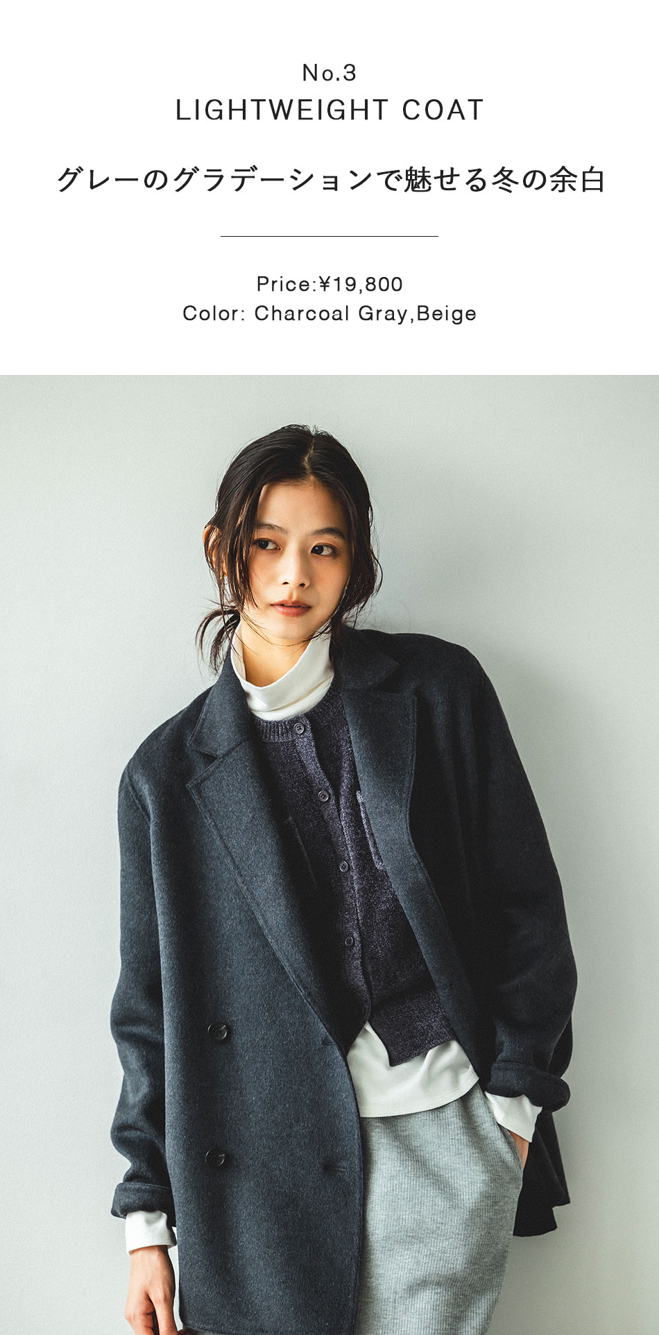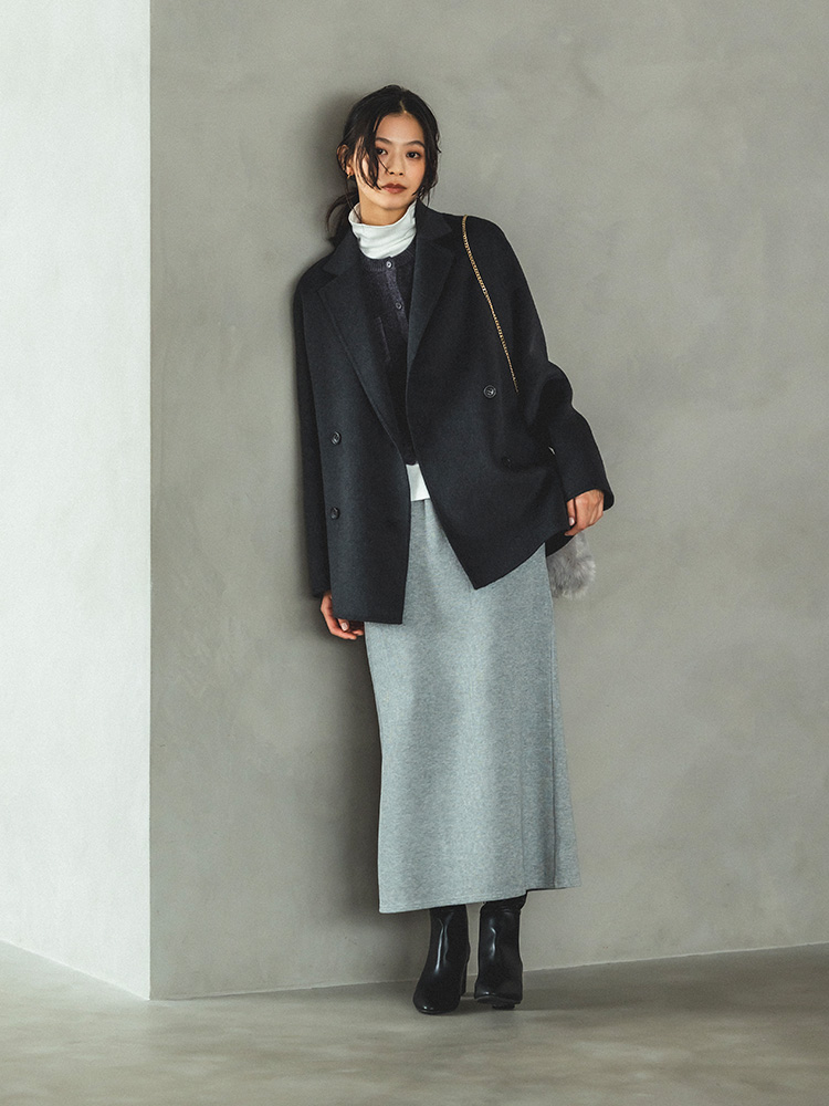グレーの濃淡でまとめた上品なワントーンスタイル。オンオフどちらにも心地よくはまるオーバージャケットコートがシックな印象をもたらし、忙しい日常を“品よく”引き締め。