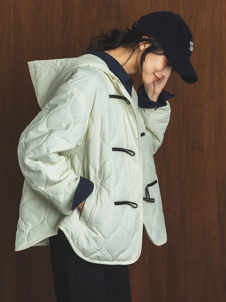 軽やかな着心地を叶えるショートブルゾン。ふっくらとしたキルティング素材と抜け感のあるアイボリーが柔らかいムードを演出。シンプルなコーデをキャップで程よく引き締め、日常に “頑張らないおしゃれ”を。