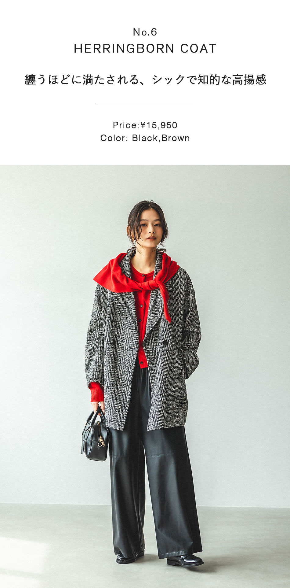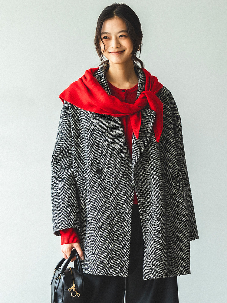 クラシックなヘリンボーンコートとワイドパンツでつくる、マニッシュなシルエット。モノトーンに映える赤が、都会的でドラマティックなムードを高める。