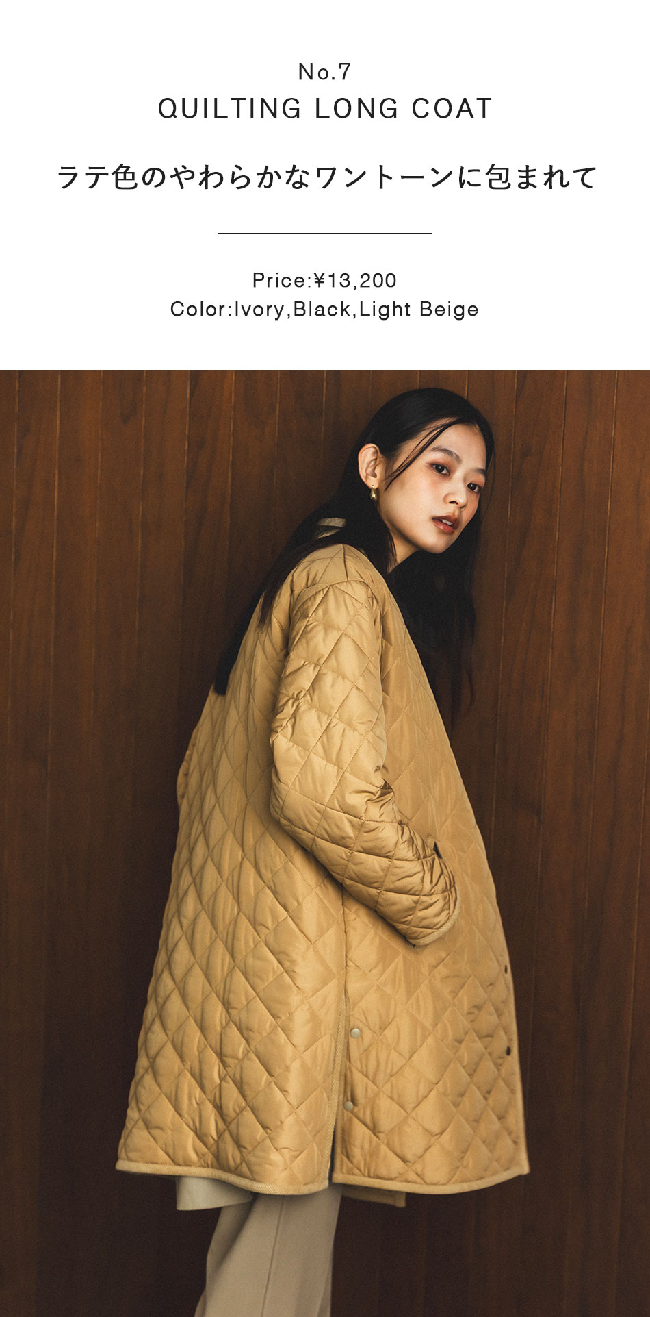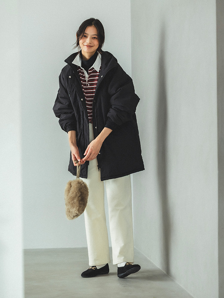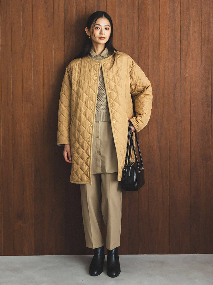 立体感のあるキルティングを主役に、異なる質感を重ねたスタイリングは、穏やかでありながら奥行きのある印象に。黒の小物で引き締めれば、洗練されたムードが叶う。