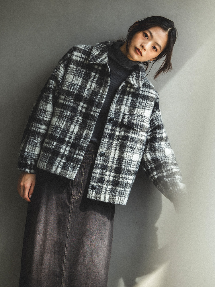 重くなりがちな冬のスタイルに、表情豊かなプードルボアのチェック柄で新鮮さをプラス。ショート丈ブルゾンとロングスカートのバランスがレディな装いを叶えてくれる。