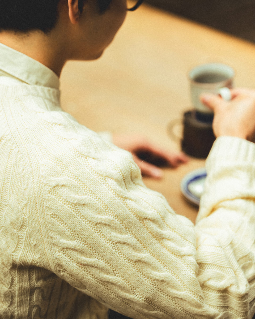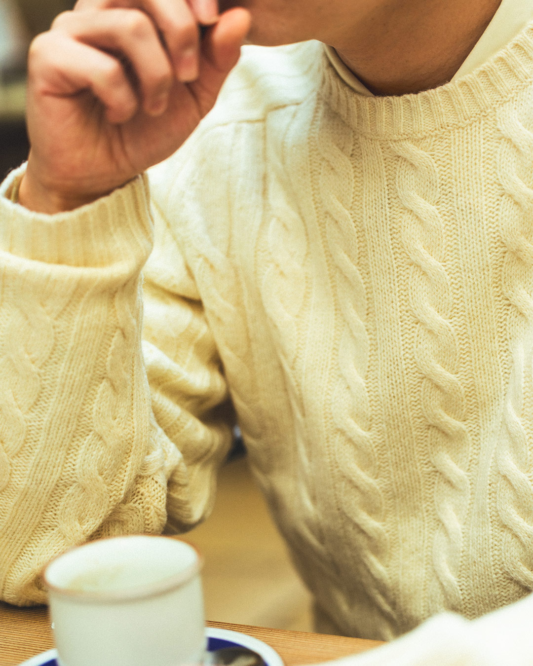 立体的な編み目が印象的なケーブルニット。厚みと温もりのある風合いで、あらゆる場面で綺麗に馴染む1枚。