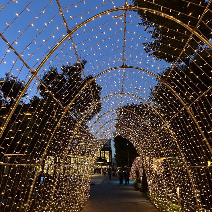 時期によってはモノレール下の通りがイルミネーションで彩られ、お散歩がもっと楽しくなるはず。お気に入りのスタイルで、パートナーとゆったり歩く。そんな何気ない“外遊び”をハッピーに変えてくれる、とっておきの場所なんです。