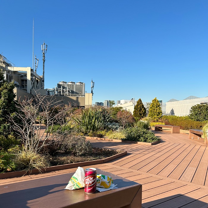 おすすめは、お気に入りのフードをテイクアウトしての“ちょいピクニック”。お昼休みに外の空気を吸いながらランチを楽しむだけで、最高の気分転換になります。ちなみに、夏場は絶好の“天サロ”スポットとしても密かに活用中(笑)。