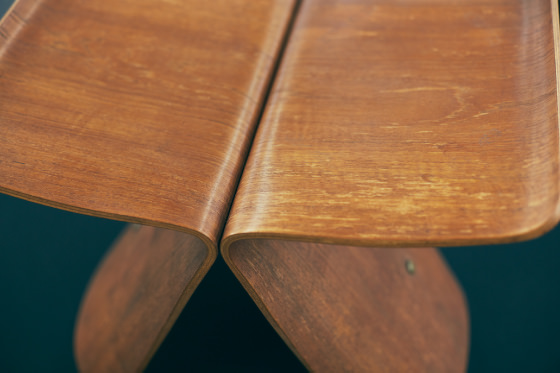 成形合板とは、単板とよばれる厚さ1mm程度しかない薄い材木に接着剤を塗布して重ね合わせ、圧力と熱によって理想の形を作る技術のこと。よく耳にするプライウッドとは、単板を重ねた合板のことを指します。それまでは、木を切る、削ることで生まれる直線的な家具が日本に限らず世界中の主流でした。しかし加工技術が発展し、軽さや使い心地のよさ、そして見た目の美しさを追求する時代の進歩が、成形合板をグローバルスタンダードへと導きました。1950年代になると、復興が需要を生み、注文家具の受注が急増。そして、1956年には、柳宗理がデザインした複雑な曲げ木のスツールをかたちにしました。パリのルーブル美術館やニューヨーク近代美術館(MoMA)のパーマネントコレクションにも展示されている、バタフライスツールの誕生です。