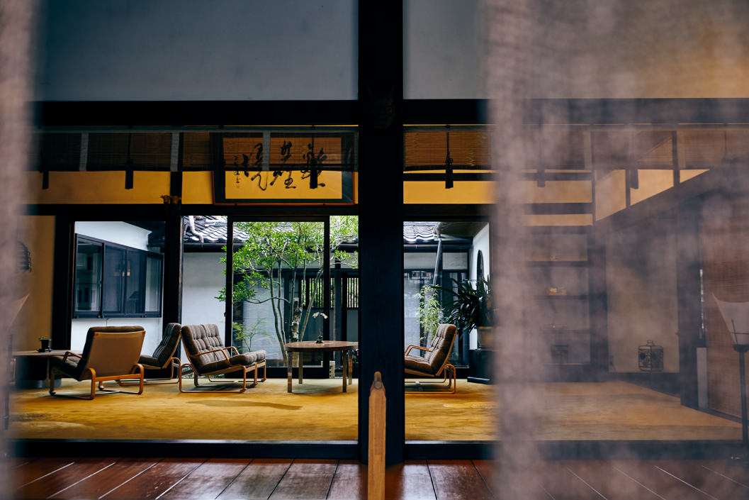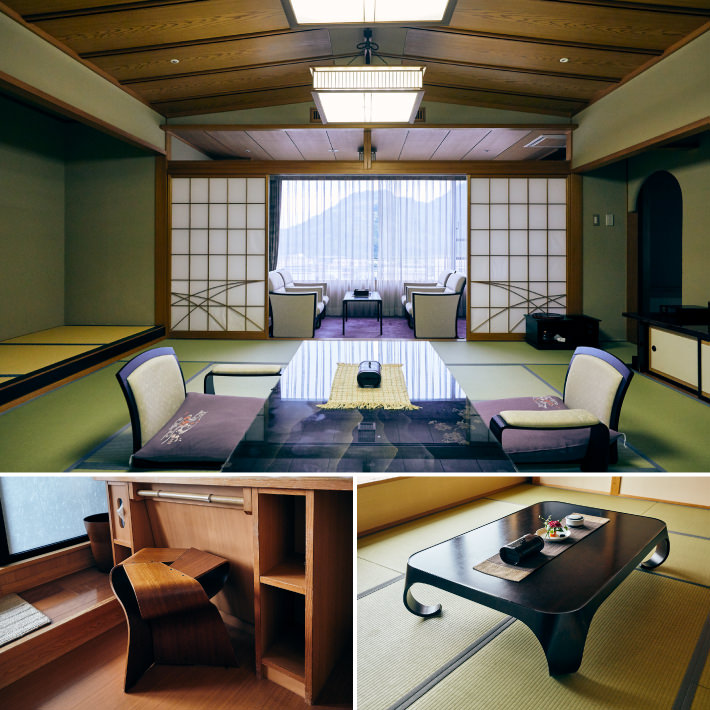 滝の湯から数分歩いた先にある「ほほえみの空湯舟 つるや」は、滝の湯と兄弟関係にあたるリノベーションホテル。手入れが行き届いた日本庭園を囲むように廊下には、低座椅子やスポークチェア、バラフライスツールなど、天童木工のクラシックな名作が開放的にレイアウトされ、どこかモダンな印象を与えています。