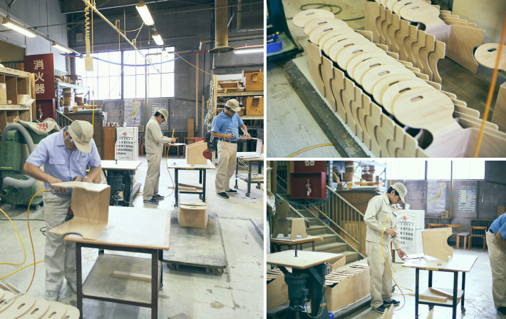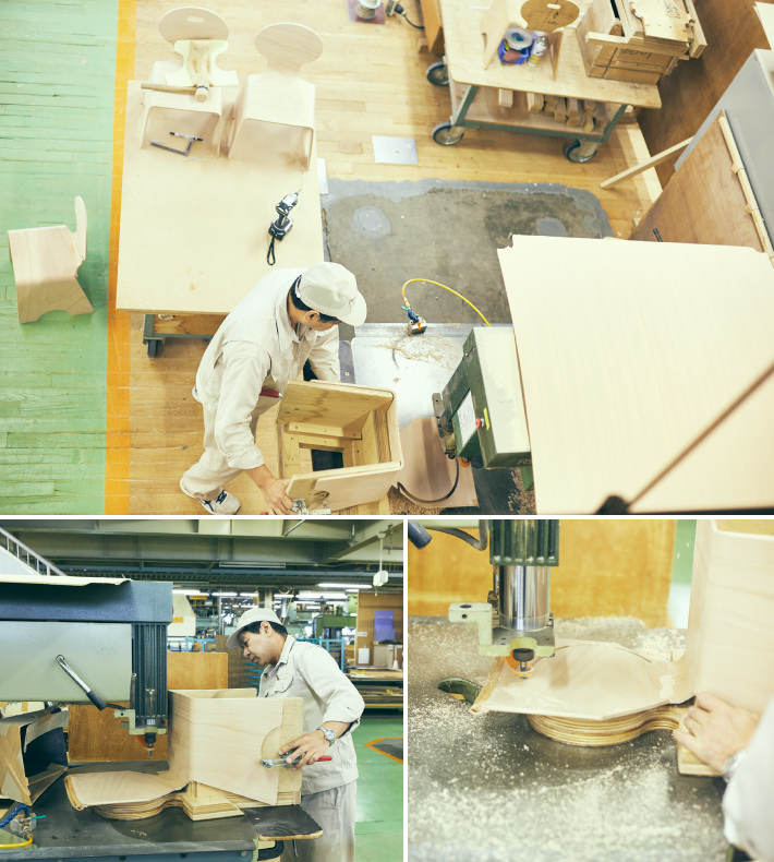 工場内で、キッズチェアの製作現場に立ち会うことができました。均一な品質で大量生産ができることが魅力の成形合板ではありますが、ひとつひとつの工程には、職人の目と手がきちんと行き届いています。