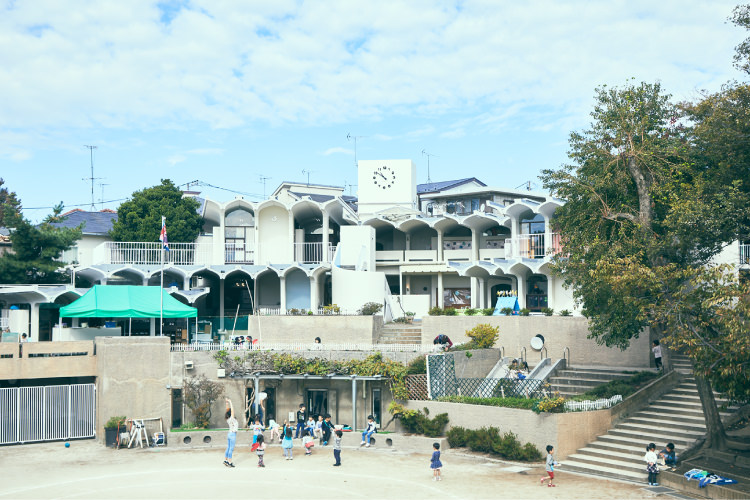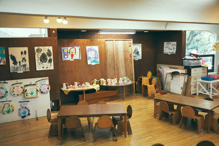 閑静な住宅街に囲まれた敷地内に建てられた園舎は、他ではなかなか見られない地下1階、地上4階からなる5階建てですが、斜面を生かして沿うように作られているので高さを感じさせません。また、白を貴重とした外観は、子どもたちの個性という色に園が彩られることを理想としているため。複雑でまるで迷路のような設計も、子どもにとっては楽しいお城です。そして月光荘の木炭や絵の具の筆を使ったり、問屋から良質のおえかきの紙を取り寄せるなど、一つ一つの道具にもこだわっています。そんな各教室に、キッズチェアが50年も使われています。芸術の中で育まれる感性を大切にする、園の教育理念が息づいています。