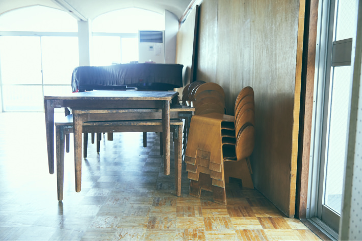 3階のお座敷部屋に並べられた座卓は、天童木工の技術者であった乾三郎によるミニマムデザイン。壁や畳を傷付けにくい、丸みを帯びた脚の設計が特徴で、見た目からは想像もつかない軽さが特徴です。