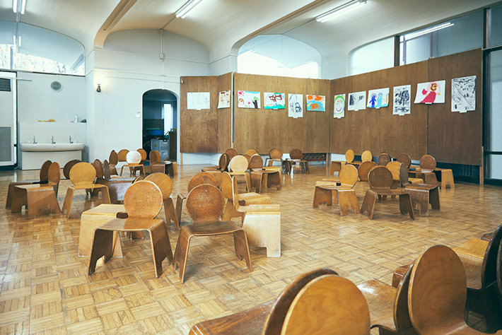 60年代から使い続けているもの、追加でオーダーしたもの。様々な年代のキッズチェアが同じ空間に並べられ、積み上がっています。それ故、ホワイトビーチの色合いが異なるのが、空間に表情と奥行きを与えています。成形合板ならではの軽さと継ぎ目のない曲線的なかたちは、子供たち自身が安心して持ち上げたり、運ぶことができます。ちなみにスタッキングは6脚まで、というきまりを園では設けているそう。