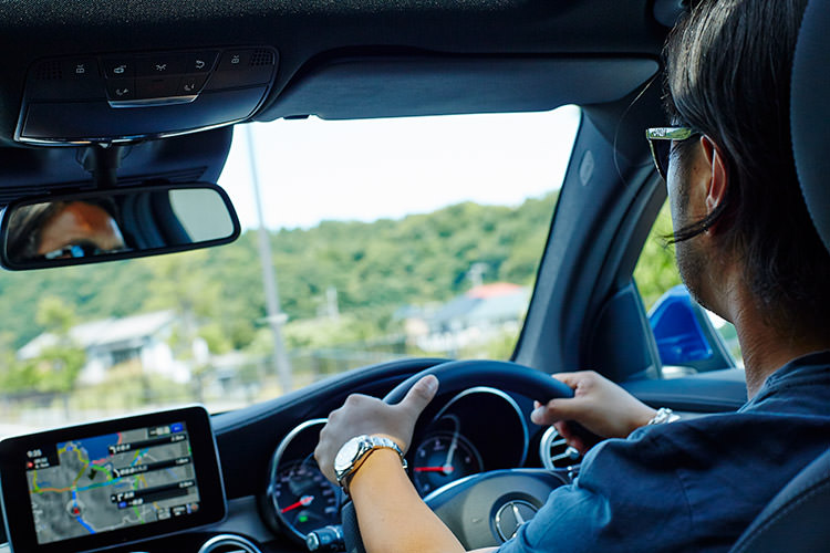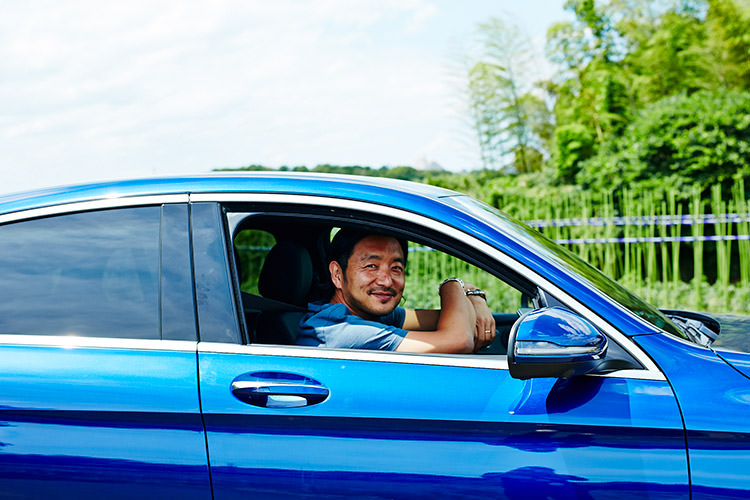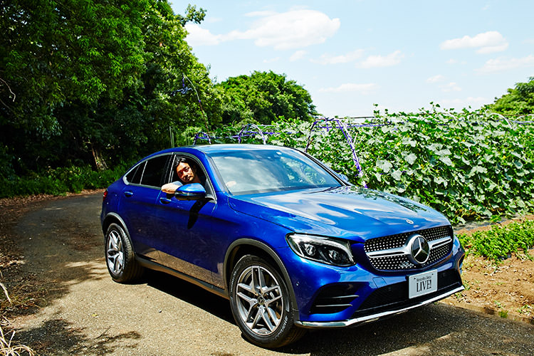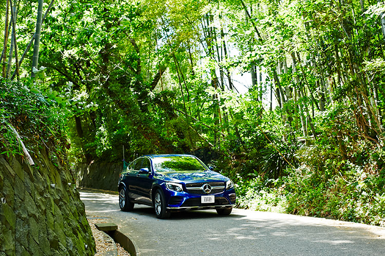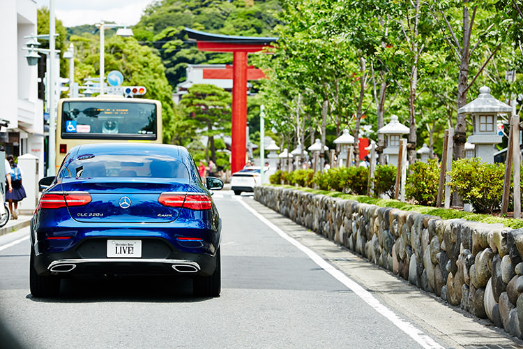今日乘った「GLC 220 d 4MATIC Coupe Sports」は、とても美しいブルーが印象的。加速が力強く滑らかで、ちょっとした遠出でも全く疲れませんでした。個人的には後ろ姿にぐっときましたね」と語る土井地。「GLC 220 d 4MATIC Coupe Sports」は、ガソリンエンジン+モーターのプラグインハイブリッドモデル。スタイリッシュでほどよいサイズ感なので、古都・鎌倉の細い道も快適なドライブが楽しめる。