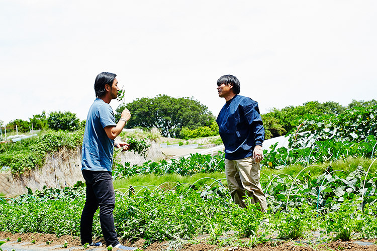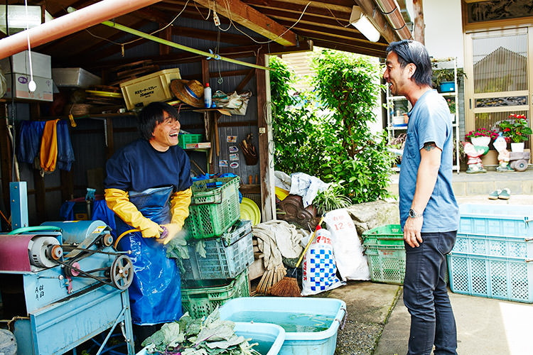 「センスがよくて人望も厚い先輩の加藤さんは、農家としても働きながら、ここから都内の本社に出勤している。それって本当に面白いし、新しい働き方だと思うんですよ」と熱く語る。「いやいや‥」と笑顔で謙遜するばかりの加藤だが、野菜の話になると顔は真剣そのもの。素早く野菜の泥を水で落としていく。