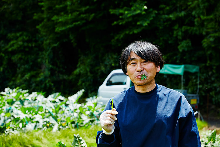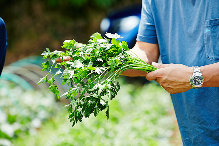 ちなみに通常「加藤野菜農園」の野菜は、さきほど通過した鎌倉駅徒歩3分の距離にある鎌倉市農協連即売所で売られている。地元の農家が協同で出店している直売所で、シェフから一般のお客さんまで気軽に鎌倉野菜や食材の買い物が楽しめるので、鎌倉にドライブに行った際は、是非立ち寄ってほしい。少し離れた畑に車で移動。竹やぶに囲まれた坂道を抜けると、緑美しい畑が広がり、お目当てのイタリアンパセリが実る場所まで案内してくれた。後ろを歩く土井地は、さながらシェ・パニーズのアリス・ウォーターのよう‥?