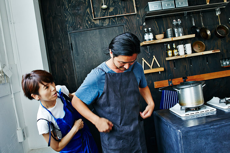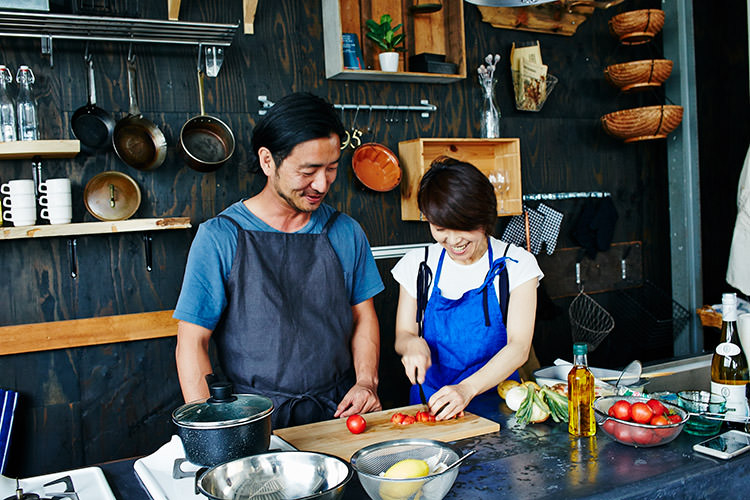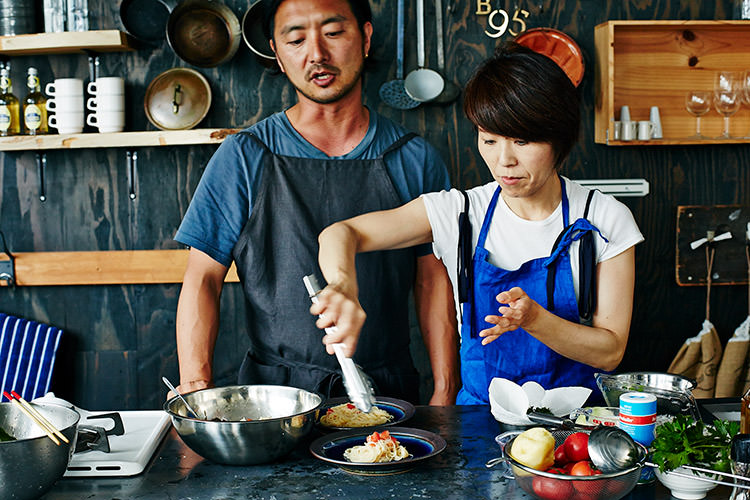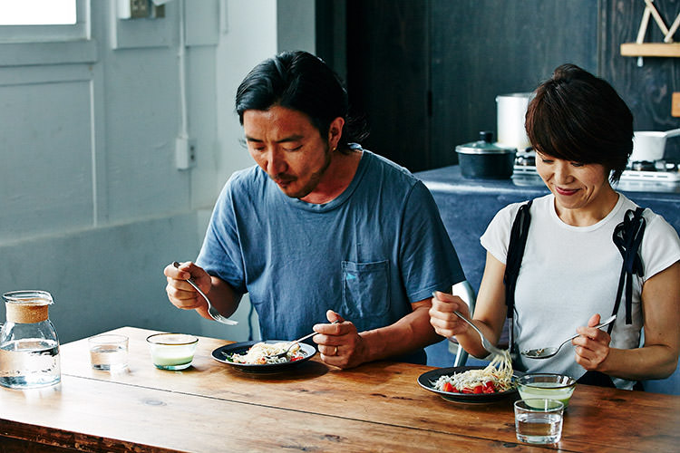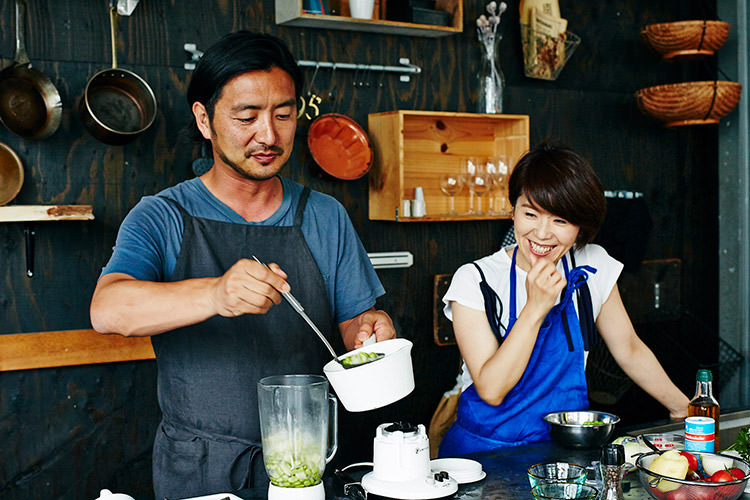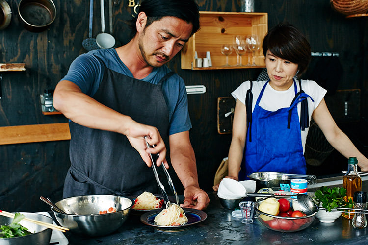 スープを冷やしている間に、パスタを準備。パスタとスープどちらも温かくても美味しいメニューではあるけれど、じめっとした6月は冷たい方がすっと食べやすい。そして、実は冷たいパスタの方が、フライパン調理がないので、料理初心者にはおすすめとのこと。まだまだ緊張気味の土井地と、子を見守る母のような笑顔のワタナベマキさん。