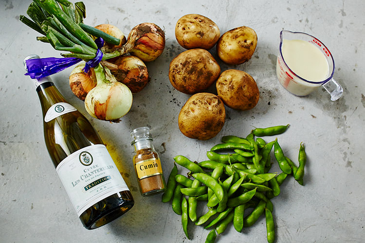 枝豆(ゆでたもの正味)約60g/じゃがいも 100g/玉ねぎ 1/4個/白ワイン 大さじ2/水 200ml/無調整豆乳(または牛乳) 200ml/塩 小さじ1/2/クミンパウダー 少々