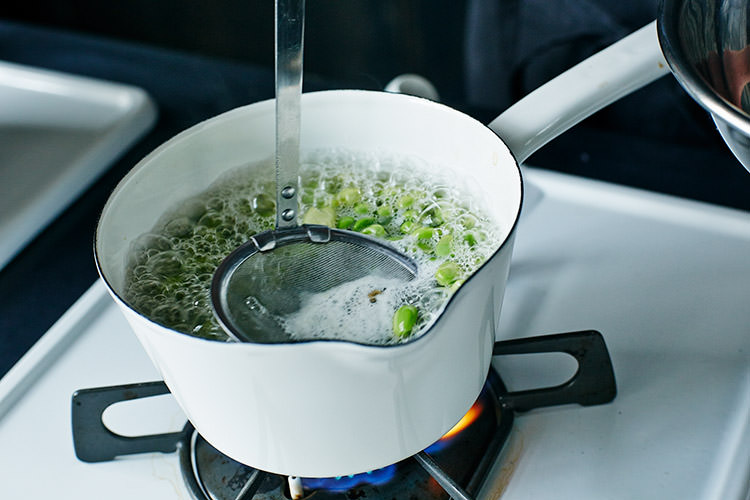 2.枝豆は塩少々の湯で約2分半茹でて、房から実を取り出す。
