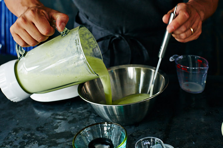 4.塩を加えて火を止め、豆乳を加えさっと混ぜる。ミキサーでなめらかになるまで撹拌し、ザルで漉す。