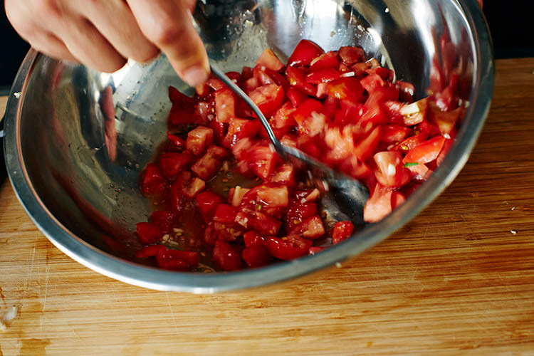 1.トマトはヘタをとり、粗く刻みボウルに入れ、にんにく、塩、レモン汁を加えて混ぜてなじませる。