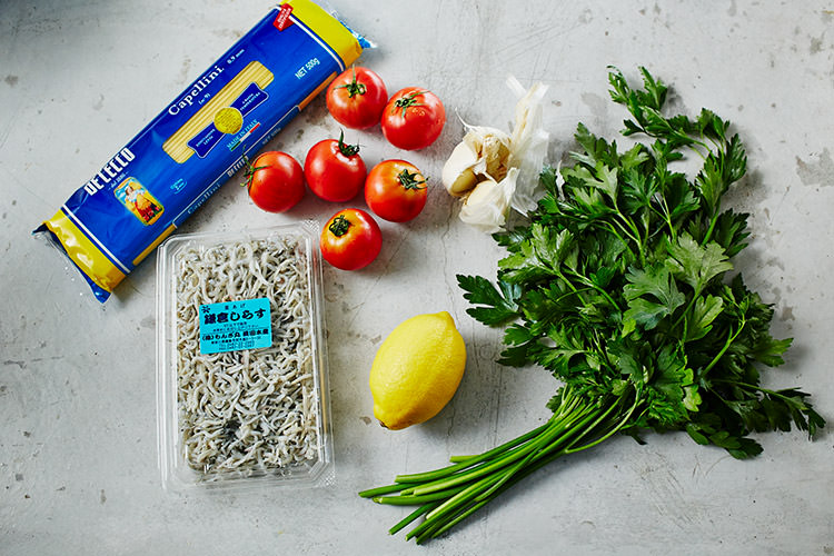 中玉トマト6個/しらす40g/にんにく1/ 2かけ/塩 小さじ1/2/オリーブオイル 大さじ2と1/2/パスタ(カッペリーニ)140g