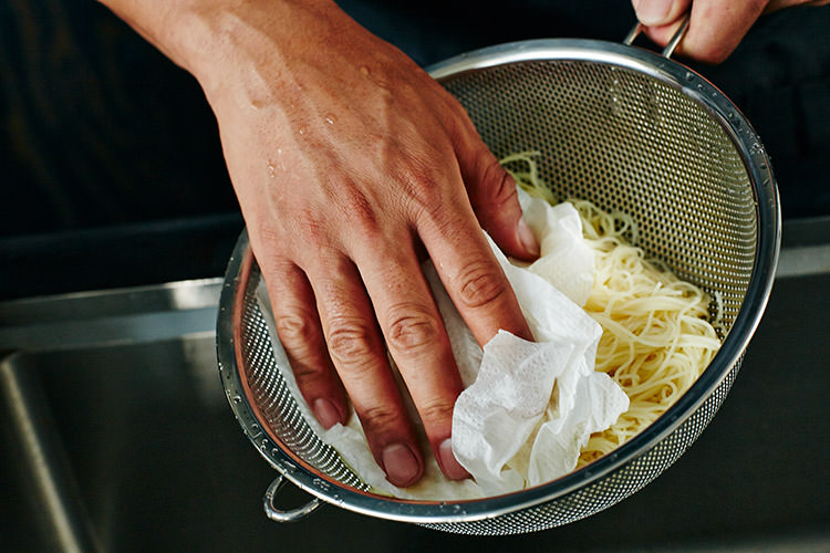 ワタナベ 冷たいパスタは水切りが重要。ザルで水を切ってから、更にキッチンペーパーで水気をとります。