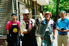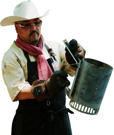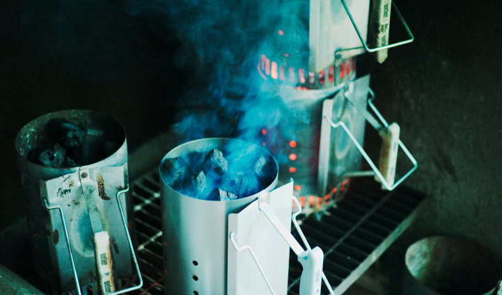 次は野外にて炭火の上に網を敷く“直火焼き”のデモンストレーションが行われます。最初に学ぶのは直火焼きに必要不可欠な炭の起こし方なのですが、ここで登場するのがチムニースターター。この器具は暖かい空気が上昇気流を起こすという原理を利用して、扇ぐ必要もなく自然に炭を起こすことができるという画期的ツールなのです。このチムニースターターで起こした炭を「スリーゾーンファイヤー」という特殊なレイアウトで並べます。この「スリーゾーンファイヤー」とは、グリルに敷き詰める炭の量を3つのゾーンに分けることで、火加減調節を上手にコントロールする方法。炭を2層にして強火、1層で中火、そして何もしかないエリアが弱火となります。さらに温度計がなくとも火加減を簡単に調べることができる「ミシシッピーテスト」も伝授。温度計のない場合でも温度を推測できる技術で、火の上に手をかざして、何秒間耐えられるかによって火の温度を推測するという原始的な方法。手をかざしながら「ワンミシシッピ、トゥミシシッピ、スリーミシシッピ・・・」とカウントし、2〜3ミシシッピあたりで我慢の限界なら高温(230℃以上)、4~5ミシシッピまで数えられるなら中温域(170~200℃)、そして10以上数えられれば低温域(140℃以下)とされています。