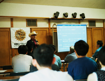 試験を受ける前に、バーベキュー基礎座学講習とバーベキューのデモンストレーションを全員が受講します。まずはバーベキュー基礎座学講習。日本バーベキュー協会の会長であり、バーベキュー検定の発案者でもある下城民夫氏から、「そもそもバーベキューとは何か?」、「日本におけるスマートバーベキューとは?」、そして「海外のバーベキュー事情」などなど、バーベキューにまつわる基礎知識の説明を受けます。すでにこの時点で、これまでのバーベキューに対するイメージは180度変わり、“野外で肉を焼くこととバーベキューがイコールではない”ということを知るはず。バーベキューって、とにかく奥が深いです…。