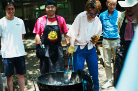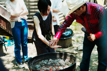 炭の特性や直火焼きでのレイアウト方法を学んだ後は、実際に食材を調理します。もちろん! ただ見て聞いて学ぶのではなく、実食も。つまり、五感すべてでバーベキューのいろはを学べるという至高の環境なのです。厚みのあるステーキ肉や鶏肉といったバーベキューのメインとなる肉の調理方法はもちろんのこと、ピーマンやシイタケといった普段なら脇役である野菜を主役級に格上げしてくれる、とっておきの方法も伝授してもらえます。さらに日本では珍しい焼きフルーツも登場。フルーツを焼いて食べる、と聞いてどんなイメージをもちますか?フルーツにもよるのですがやはり感想は様々で、美味しいという人もいれば、渋い顔をする人も。しかし、そんな感想を伝え合うことが立派なコミュニケーションとなるのです。ただ焼いて黙々と食べるのではなく、食べることによって生まれるコミュニケーション。これもバーベキューの醍醐味なのです。