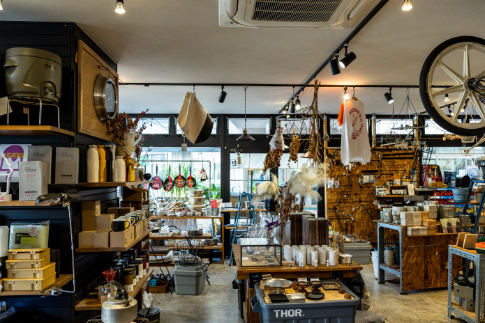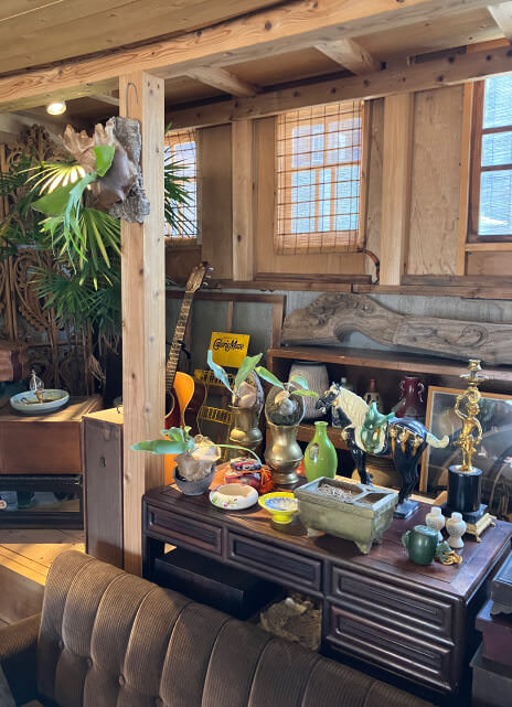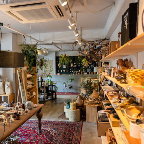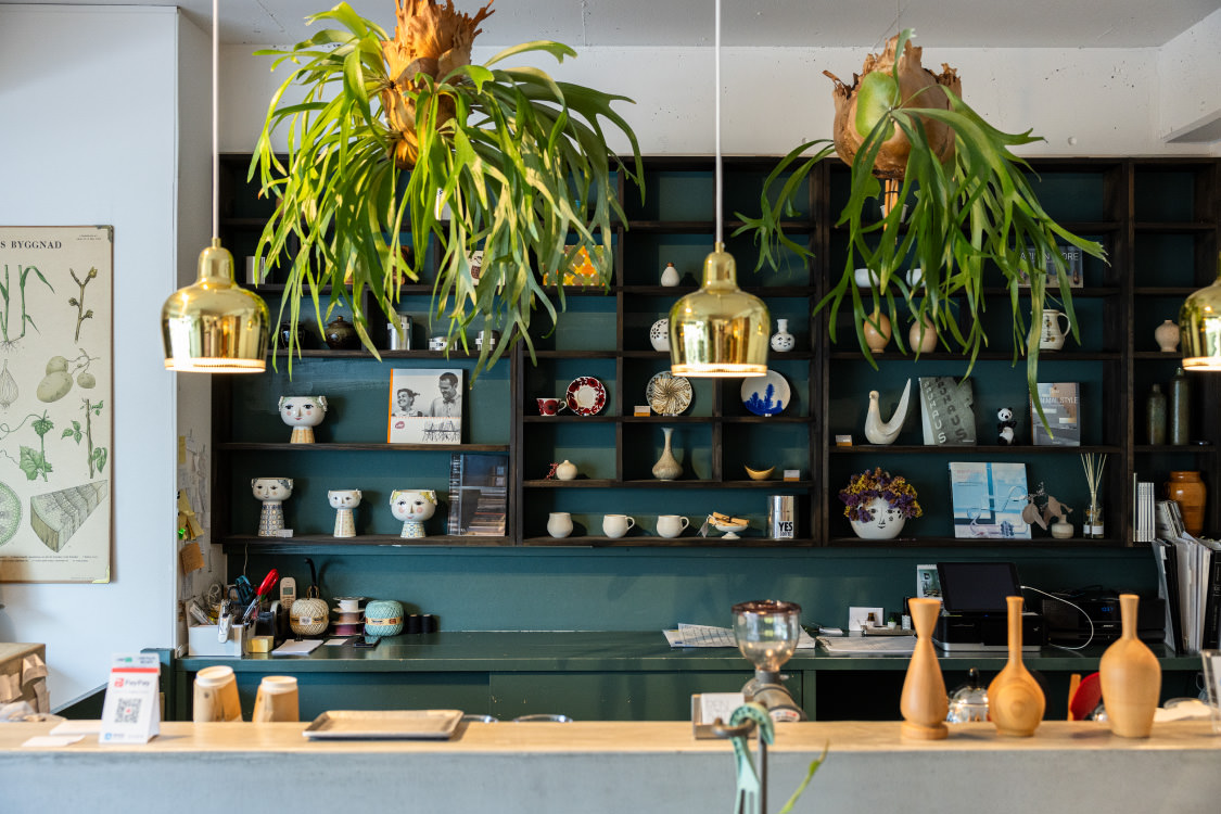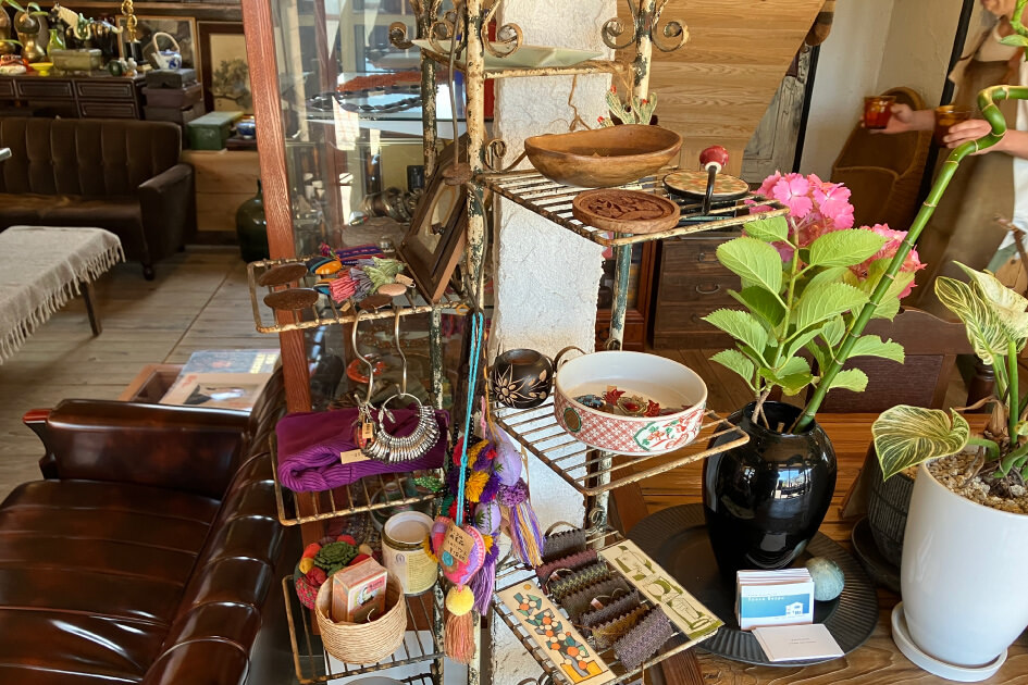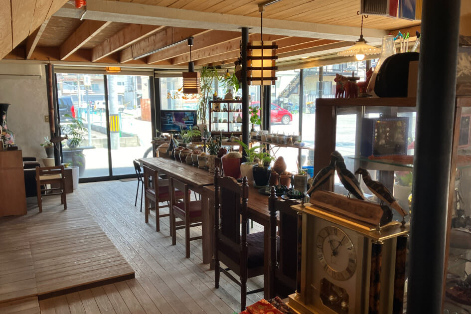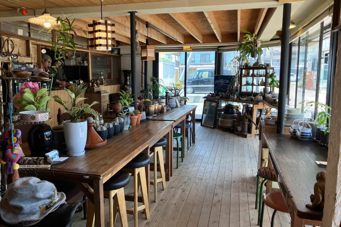 鉢に植えられた無数の植物や古道具、骨董品などの雑貨がずらりと並ぶ店内。実は喫茶店であり、特にカレーはローカルたちを虜にしている。お手製のジンジャーエールとケーキも忘れずに!