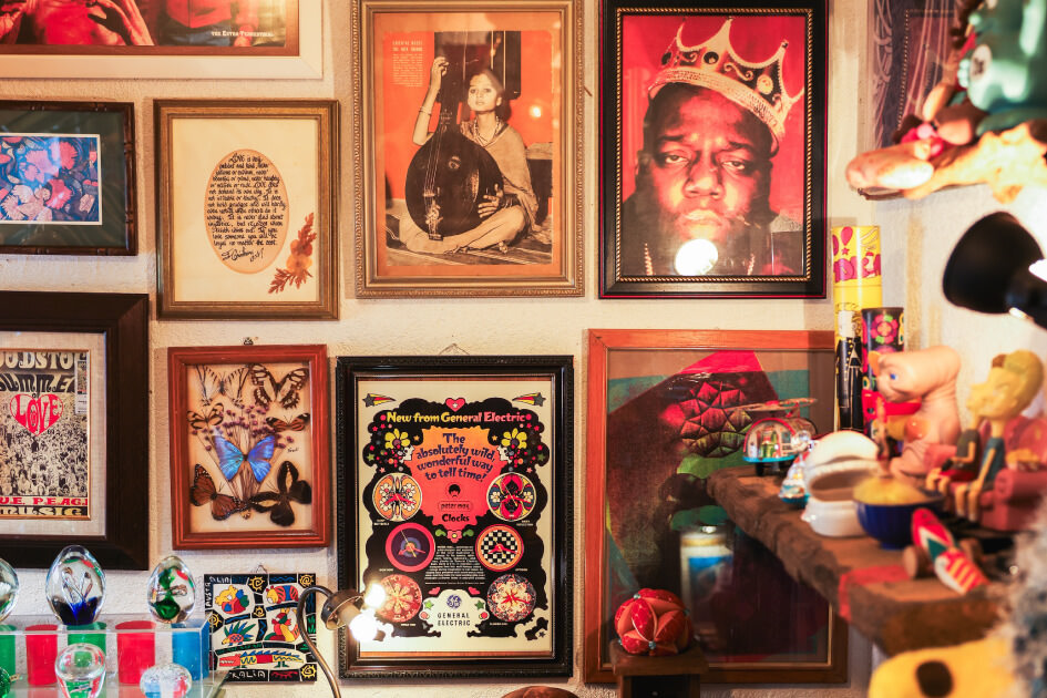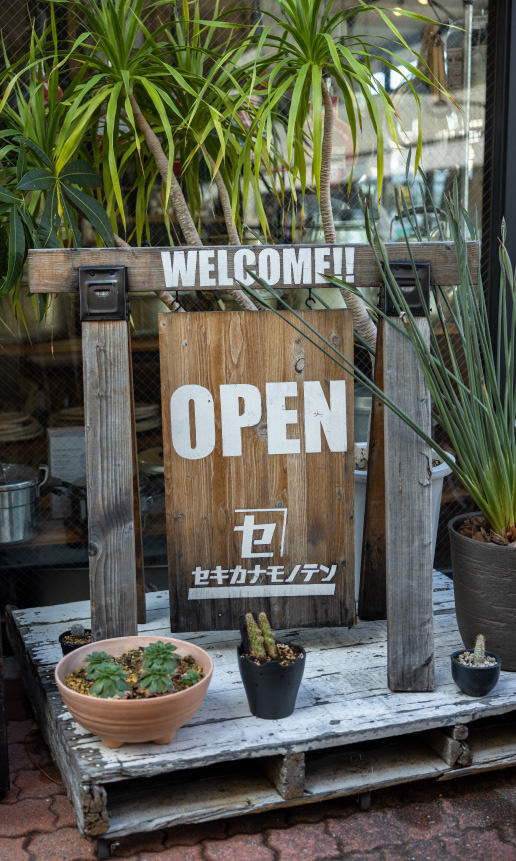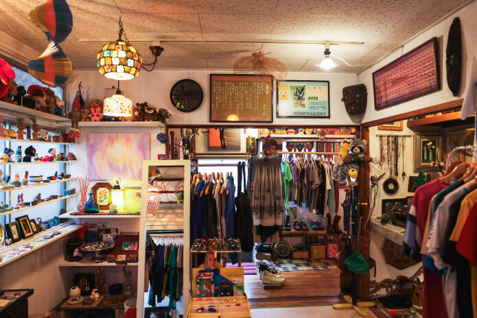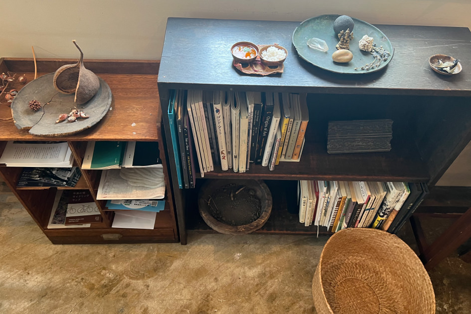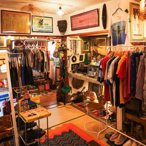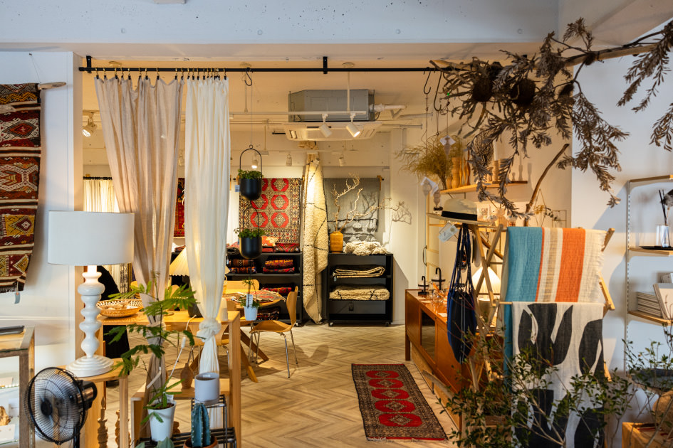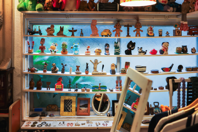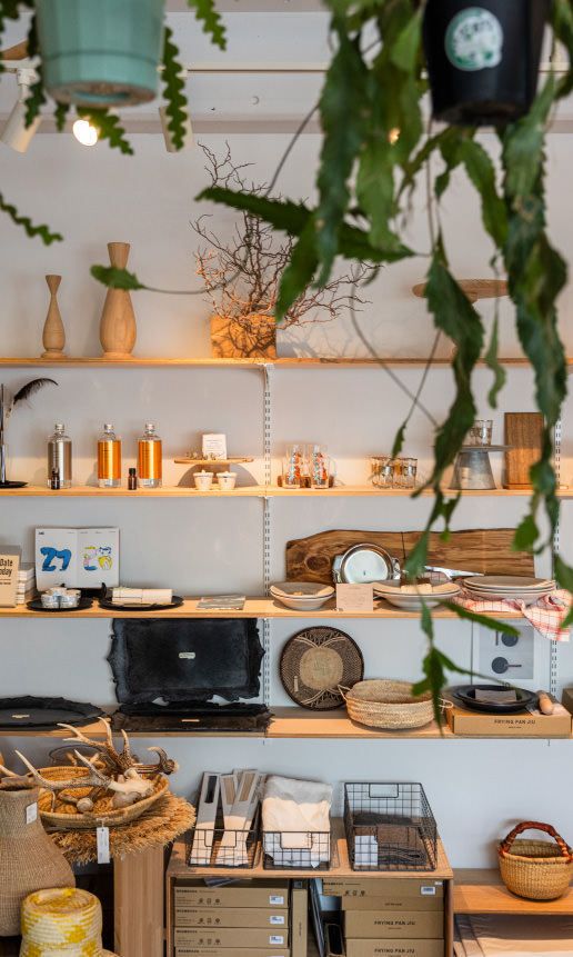 鉢に植えられた無数の植物や古道具、骨董品などの雑貨がずらりと並ぶ店内。実は喫茶店であり、特にカレーはローカルたちを虜にしている。お手製のジンジャーエールとケーキも忘れずに!