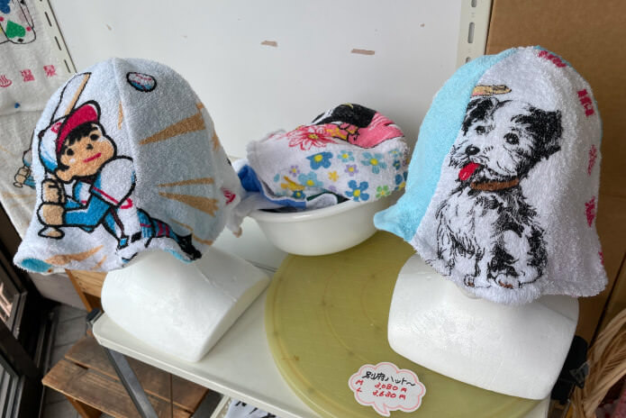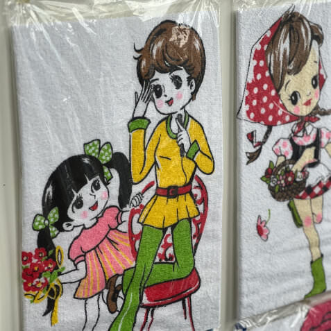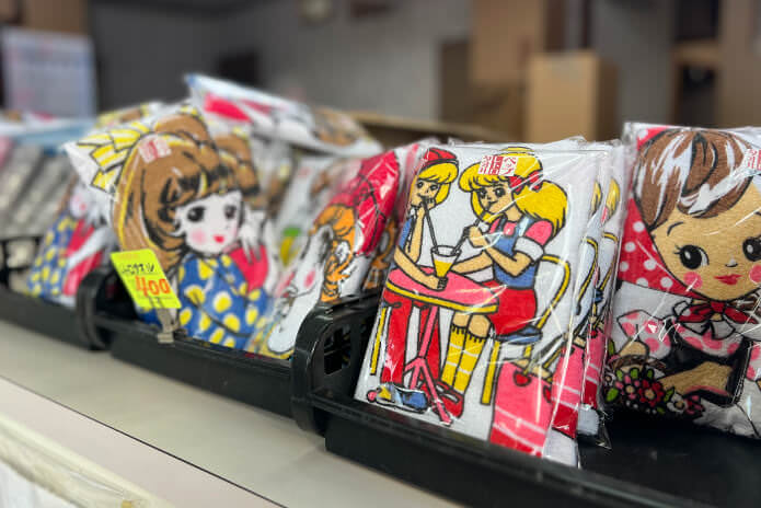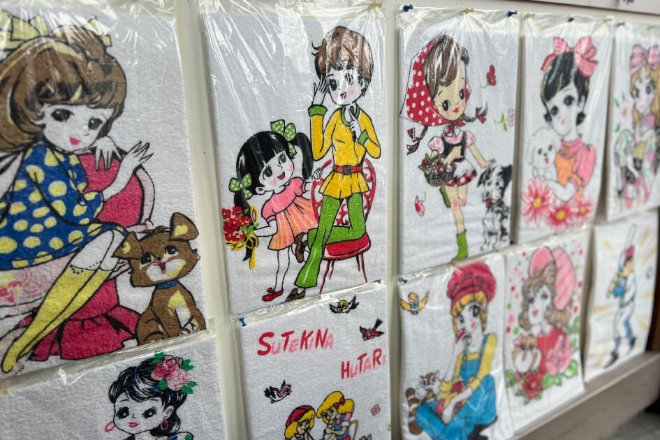 別府で湯めぐりをするときに、手持ちのタオルがないならこちらで購入を。昭和30年代に使用されていたイラストをプリントされたタオルは、お土産としても人気が高い。店内はタオルでいっぱい!