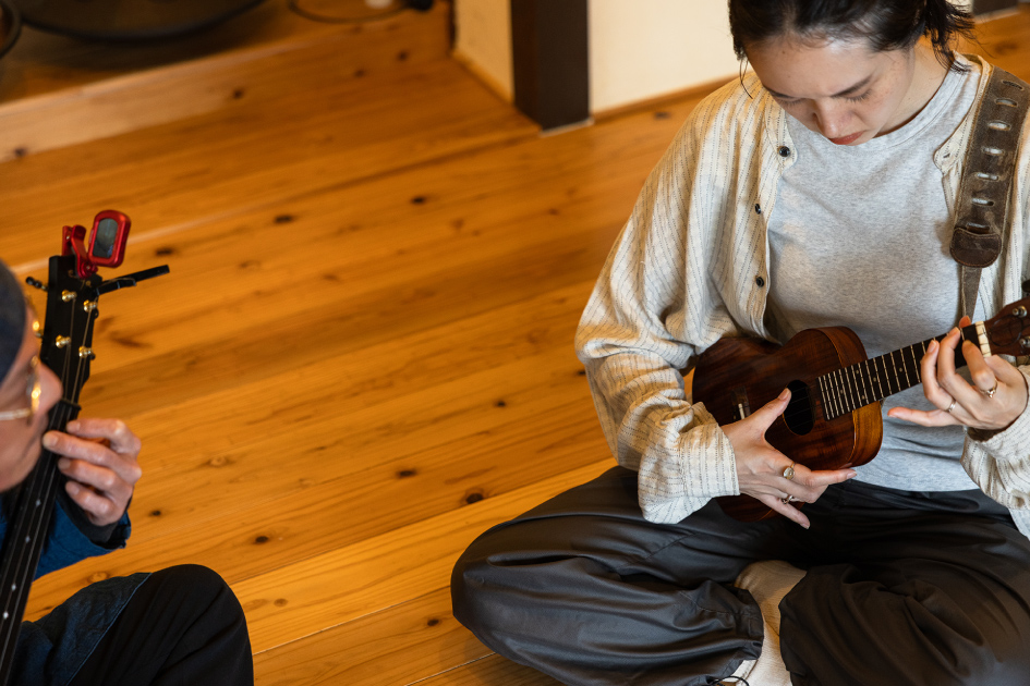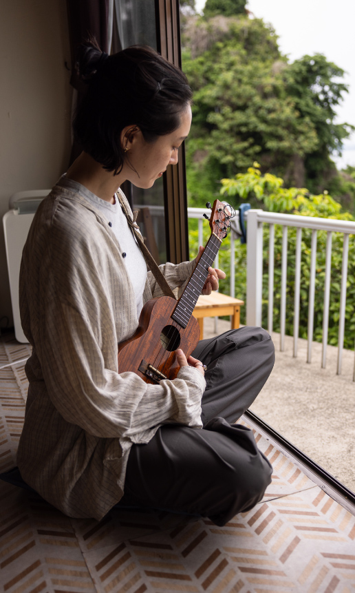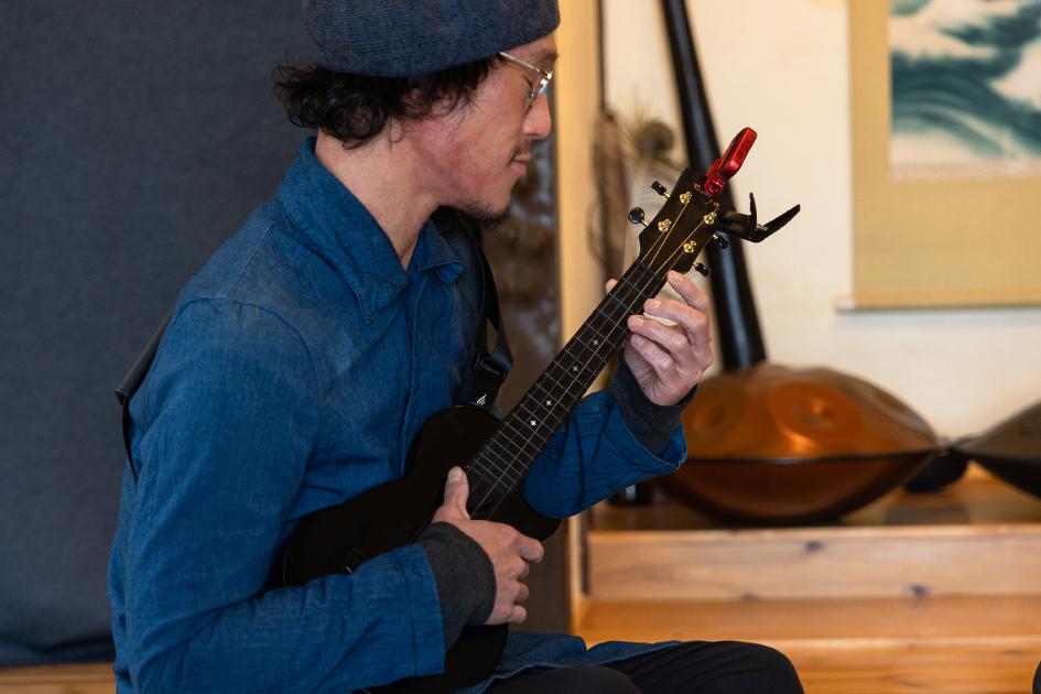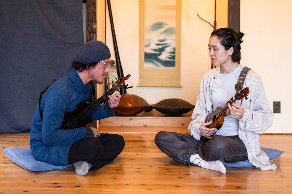 別府湾が見渡せる音楽教室には、ギターやウクレレをはじめ、ジャンベやシタールなど各国の民族楽器も揃っている。世界を旅してきた先生と一緒に気持ちのいい空間でセッションをすれば、新しい扉が開くかも!
