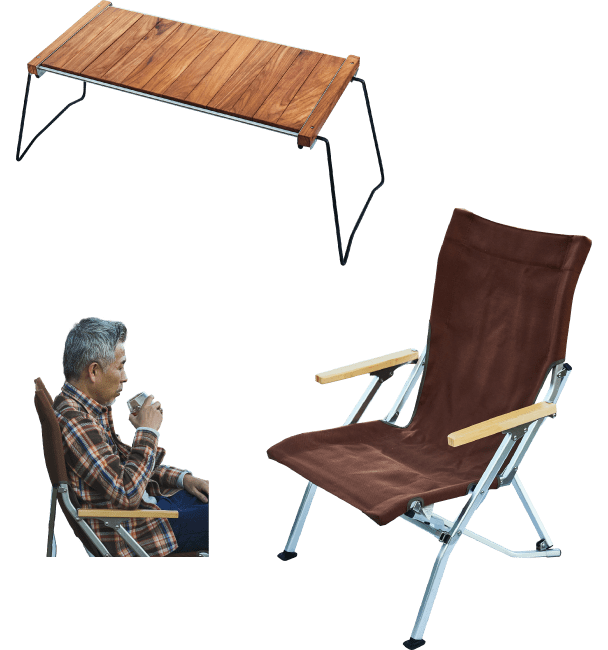 みんなが快適に過ごせるようテントはもちろん、チェアやテーブル、そしてコーヒーグッズ、バーナー、鍋に至るまで、あらゆるシーンを想定して携行ギアを選ぶという堀越さん。