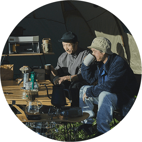 テントを張り、ギアを並べたら設営も完了。淹れたてのコーヒーとともに一息つきます。「キャンパーはみんなこの瞬間のために設営頑張るんだと思いますよ(笑)」と話す通り、笑顔溢れる光景が出来上がっていました。