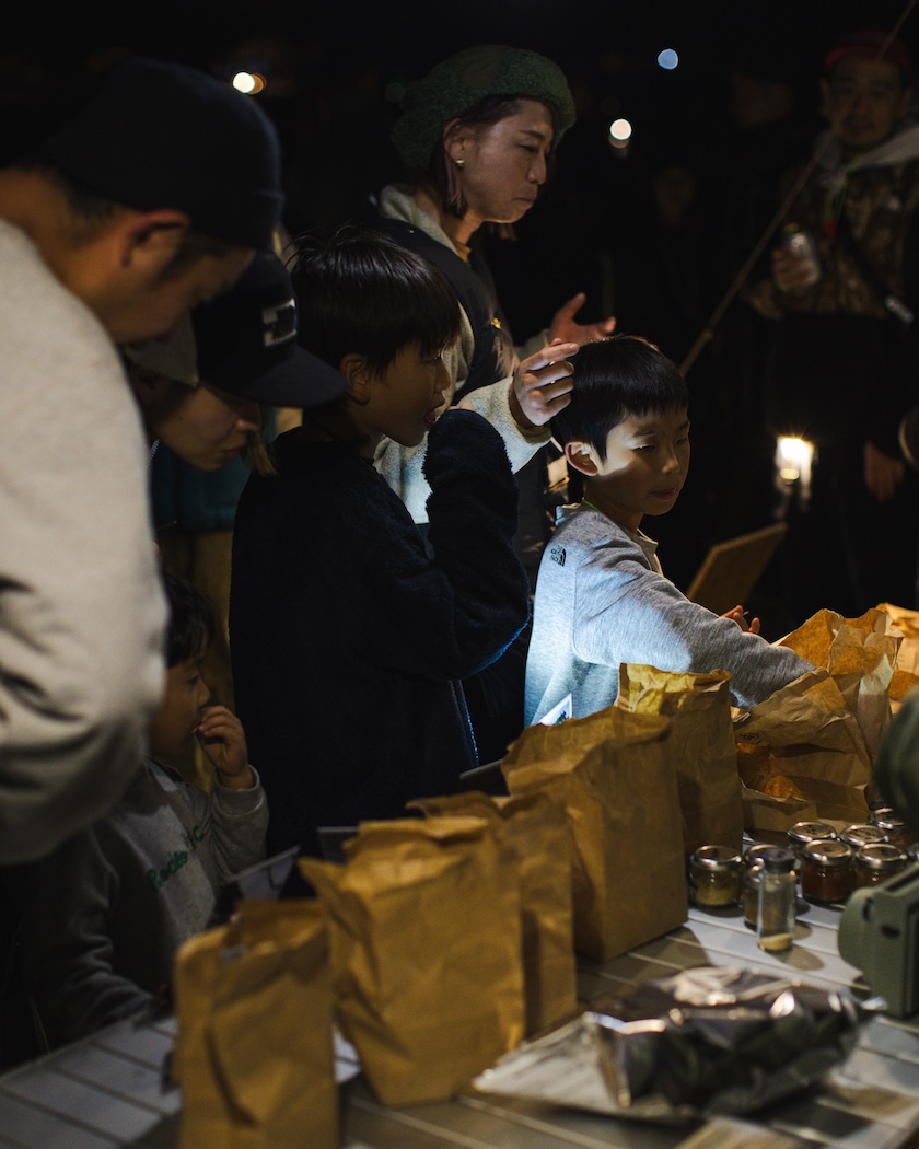 ランタンや焚き火の灯りで照らされるテントには料理が並び、火を囲みながら交わされる会話は時間を忘れてしまうほどあたたかいものに。