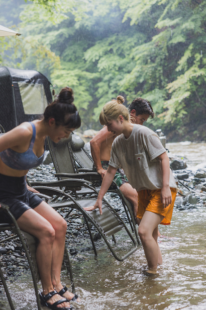 この日、3人がやってきたのは山梨県にある「水源の森 キャンプ・ランド」。同名にてオリジナルブランドも展開している〈キャンプクルー〉がディレクションするこの施設は、キャンプができて、キャビンもあって、シャワーもあるしクラブハウスも併設。手ぶらで来ても楽しめると人気の場所だ。