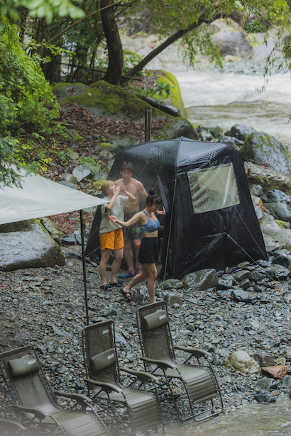 同施設内にはキンキンに冷たい道志川が流れている。その川沿いにテントサウナが常設されている。ここが今回の目的地。