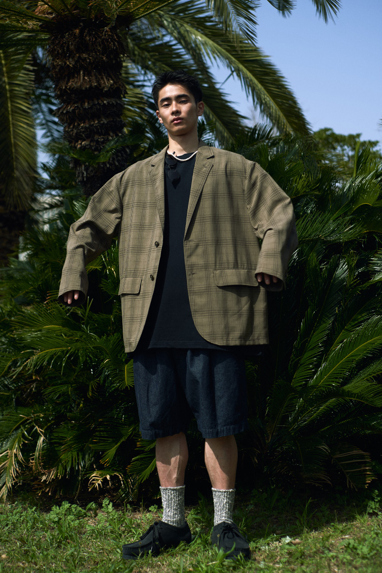 一見、サマーウールのようなテーラードの生地かと思いきや、ポリエステルを使用したジャケット。軽量で清涼感があり、チェック柄と色味に趣があって軽々しく見えない、そんな一着を羽織って夏場でもパリッと見えるスタイリングを組もうと、オーバーサイズのTシャツ、ゆとりのあるデニムショーツを合わせてみました。ジャケットのボリューム感とのバランスを意識し、シューズには〈クラークス オリジナルズ〉の『ワラビー』を。これだけでも十分まとまっていますが、パールネックレスでモード感をミックスすることでよりフレッシュな印象になったと思います。
