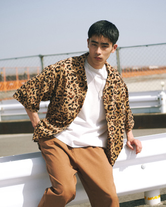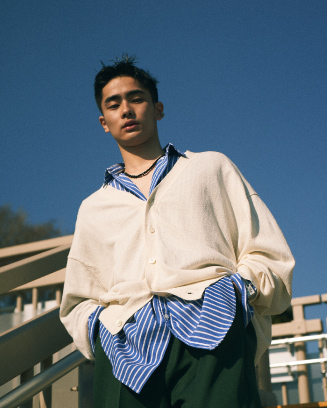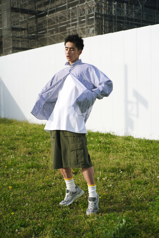イメージは昔のビースティ・ボーイズ。とくにポージングの指示はしなかったんですが、モデルのKEIGOくんが感じ取ってくれました。シャツは着丈がそこまで長くなく、どちらかというと身幅と袖の大きさが特徴だったので、トップボタンだけ留めることで横のボリュームを強調しながら、中に着たTシャツの色をアクセントにしています。また、ビースティ・ボーイズということで足元は、彼らが履くことでシグネチャーのように人気が出た〈プーマ〉の名作『プーマ スエード』。膝上丈の短めのショーツとスニーカーとのバランスをとって、靴下は短めでアクティブな印象に。