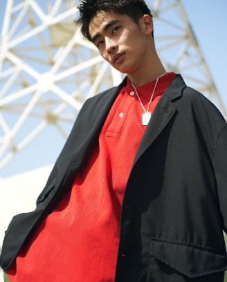 同じ生地のジャケットとパンツは、それぞれセットアップで展開しているものをバラしてスタイリング。紺ブレに軍パンを合わせたようなストリート的に解釈したトラッドスタイルをイメージしながら、生地とサイズ感を活かして今のエッセンスを取り入れてみました。中に着たビッグサイズのポロシャツでオーセンティックさを程よく残しつつ、足元はローファーやデッキシューズではなく、ビーチサンダルでラフに。セオリーをなぞりながらも、それをアレンジすることでファッションを楽しむ幅がさらに広がります。
