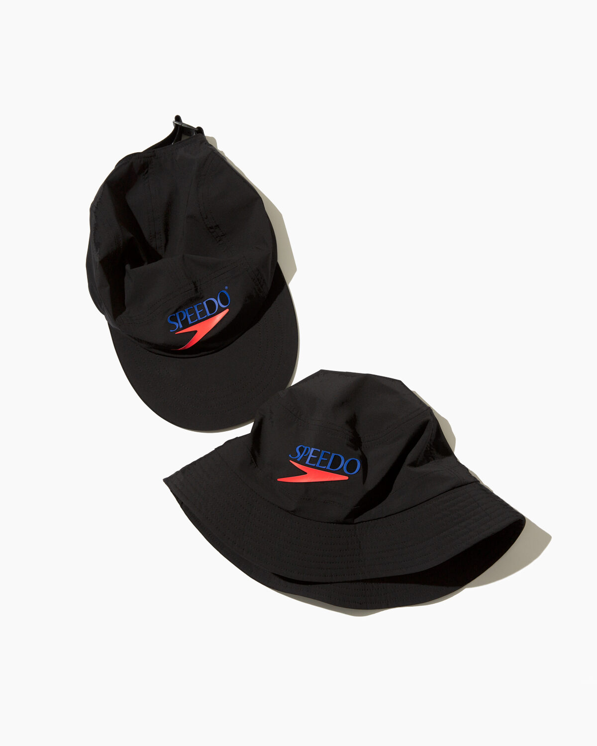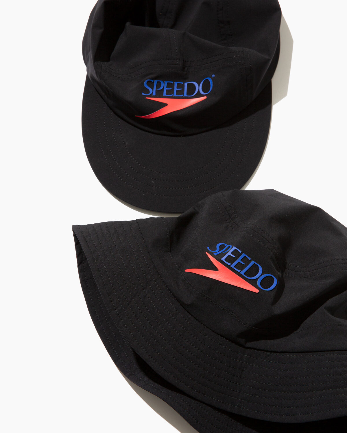 今回のコレクション全てに共通して採用された<Speedo>のクラシックロゴは本コラボレーションのエクスクルーシブデザイン。また、日本で企画、デザインされたつば付きのタウンユースキャップとハットの発売は<Speedo>として初めてとなります。