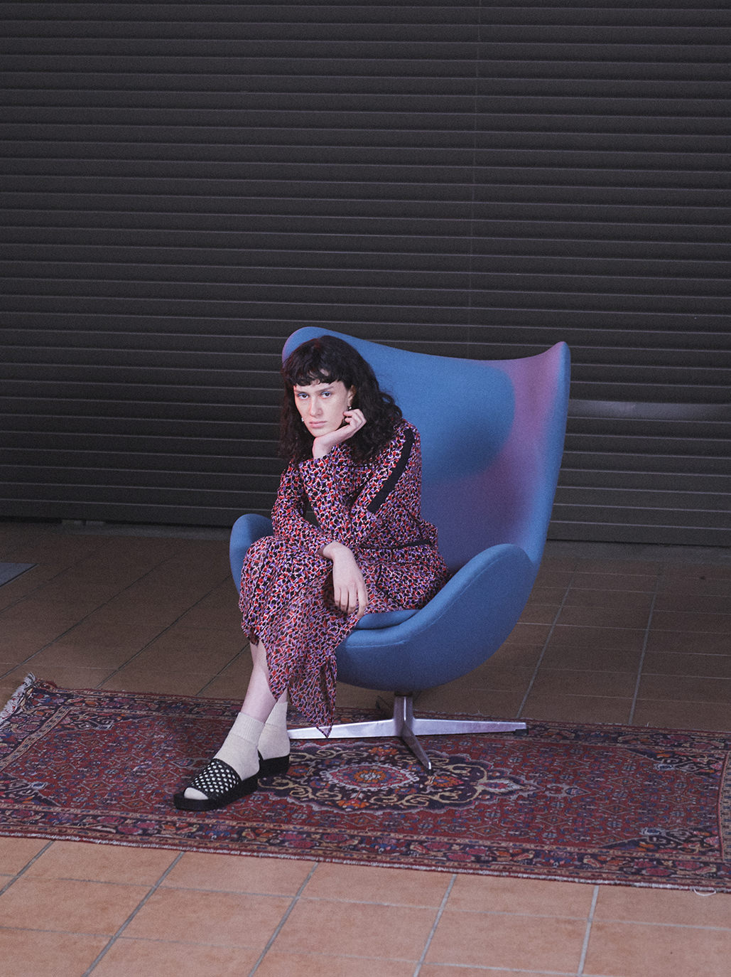 アーティスティックな曲線とバックに施されたリボンがフェミニンなブラウス。構築的なトップスでレトロムードのスカートもモダンな印象に刷新。