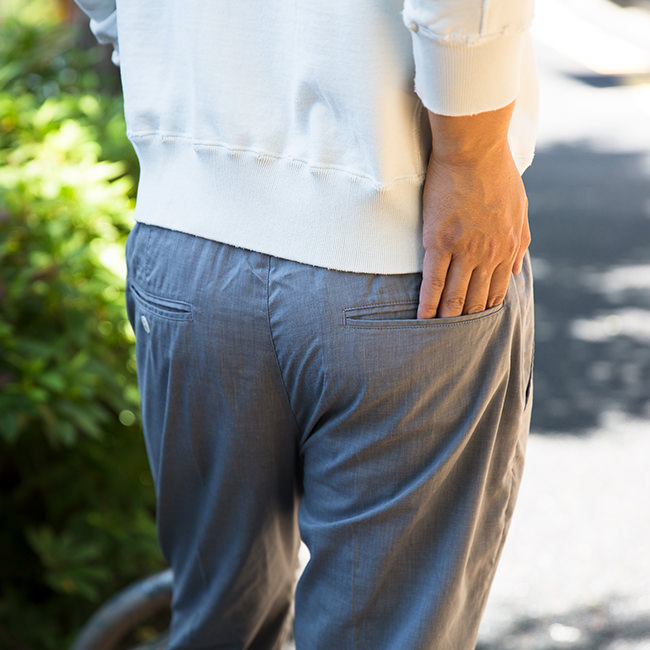夏に最適な機能素材なのに、まるでリネン混のような素材感だし、スラントポケット、クリース入りにダブル裾とドレス仕様。ウエストはゴムリブドローコードでイージーと来た!! でいて、バックポケットを見れば、往年のチノに見られる玉縁仕様♪