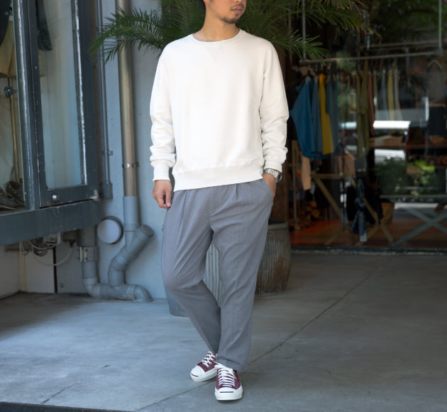 それは私が20代前半、“お洒落のプロたちが捨てられないスウェット”というテーマで取材をしていたときのこと。今じゃスウェットにもUSED加工をあえて、的なモデルも出てきて定番化していますが、そのデザイナーさんは両Vに輪編みバインダーにリブ、2本針縫製とバリッバリにエイジングした1950年代のヴィンテージを持ってきたんです。モノ的にはとても価値があるんですが、どーやって普段着るんだ??と素朴なギモンをぶつけると……「グレースラックスに合わせれば何でもお洒落になるんだよ」
