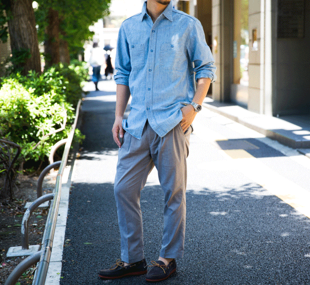 先述した「テレコの法則」について少し触れておきましょう。“テレコ”とは歌舞伎用語で、一幕おきに交互に展開することを呼び、そこから転じて互い違いという意味で使われるようになったらしい。なーんてウンチクはさておき、ここで言う“テレコ”とはカジュアルとドレスを互い違いにするということ。今回のヤミツキパンツはトロピカルウール調のクリース入りスラックスとドレス寄り。だから合わせるトップスはカジュアルなスウェットということになるわけです。この法則にあてはめれば、シャンブレーシャツ、へヴィウェイトTシャツ、ハワイアンシャツ、なーんていう、他のどカジュアルなアイテムだってご覧のとおり!私を含めたお洒落弱虫だって、こなれたコーデが実践できちゃう♪
