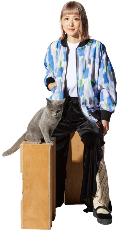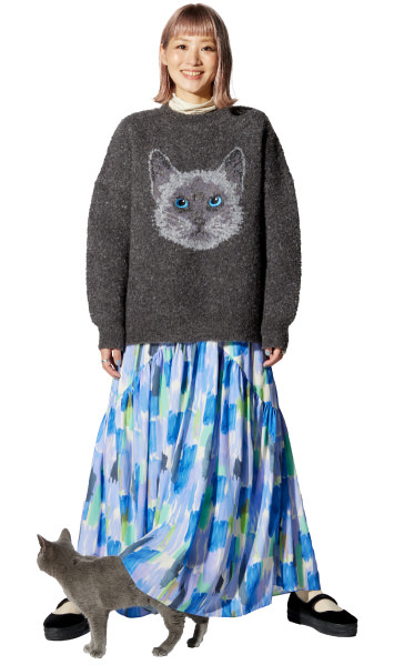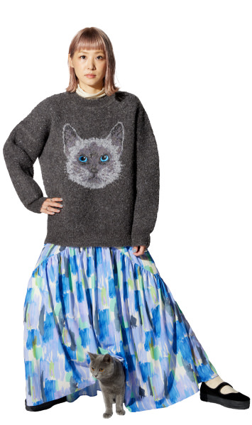 その程よさを狙いました。カラーは初号機と2号機、ふたつのエヴァをモチーフにしていて、水彩絵の具で塗ったようなランダムな色使いで、ポップだけど落ち着いた感じに。さりげなく入ったグリーンはまさに初号機だし、2号機のオレンジの効かせ方もアスカを感じさせてくれる。秋冬こそ明るい色を着たいから、すごく嬉しいです。