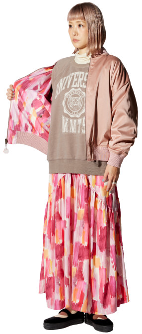 〈マミタス〉のブルゾンはいつも人気のアイテムなんですけど、今回も年齢問わず楽しめる一着になりました。女の子はスカートとセットアップにしてもいいと思うし、男の子がさらっと羽織るのもきっと似合う。裏地のピンクがまた絶妙なカラーリングだから、気分でリバーシブルにするのもいいんじゃないかなと。ぜひカップルで着て欲しい!