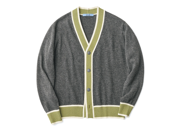 配色がモダンなウールカシミアチルデンカーディガン。バランスを見直した別注モデルです。