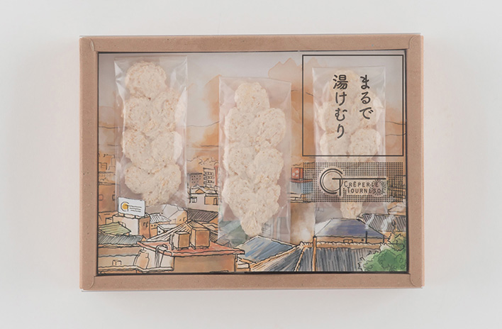 『まるで湯けむり』は、その第1歩となる商品だ。鉄輪の風景の上に湯けむりの形のメレンゲが並んだ、立体感のあるパッケージデザインにも、多くのこだわりが込められている。「持ち歩いてもメレンゲが壊れにくいよう、箱詰めにしています。この箱は、私のこだわりを地元の紙器メーカーさんが形にしてくれたものです。一目で鉄輪の風景を伝えることができるよう、デザイナーさんとやりとりを重ねて絵柄も試行錯誤したんですよ。二重構造になっているので、下の段にポストカードやリーフレットなど旅の思い出を詰めて、取っておいてもらえたりすると嬉しいですね」