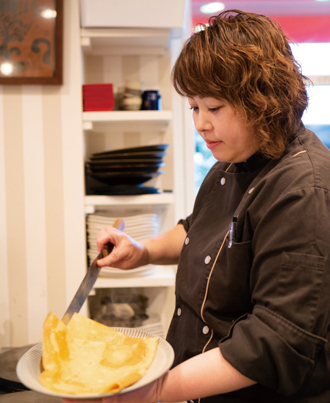 このお菓子を開発したのはクレープとガレットの店「クレープリー・トゥルヌソル」の大山里美さん。大山さんは大阪でレストランパティシエとしての経験を積み、2017年に生まれ育った別府にこのお店を構えた。「ものを捨てるのが嫌なので、注文を受けてから作るクレープとガレットのお店にしようと考えました。焼きたてをお出ししているので、その最高の瞬間を召しあがっていただきたいです」と熱を込めて語る。