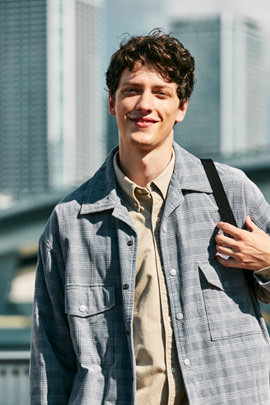 十分なハリとコシ、厚みもあるストレッチコーデュロイを採用した軽アウターは、前身頃のヨークと重なった特徴的なポケットデザインが目を引くダブルマッキーノ型で。同素材のイージーパンツとセットで楽しみたい。